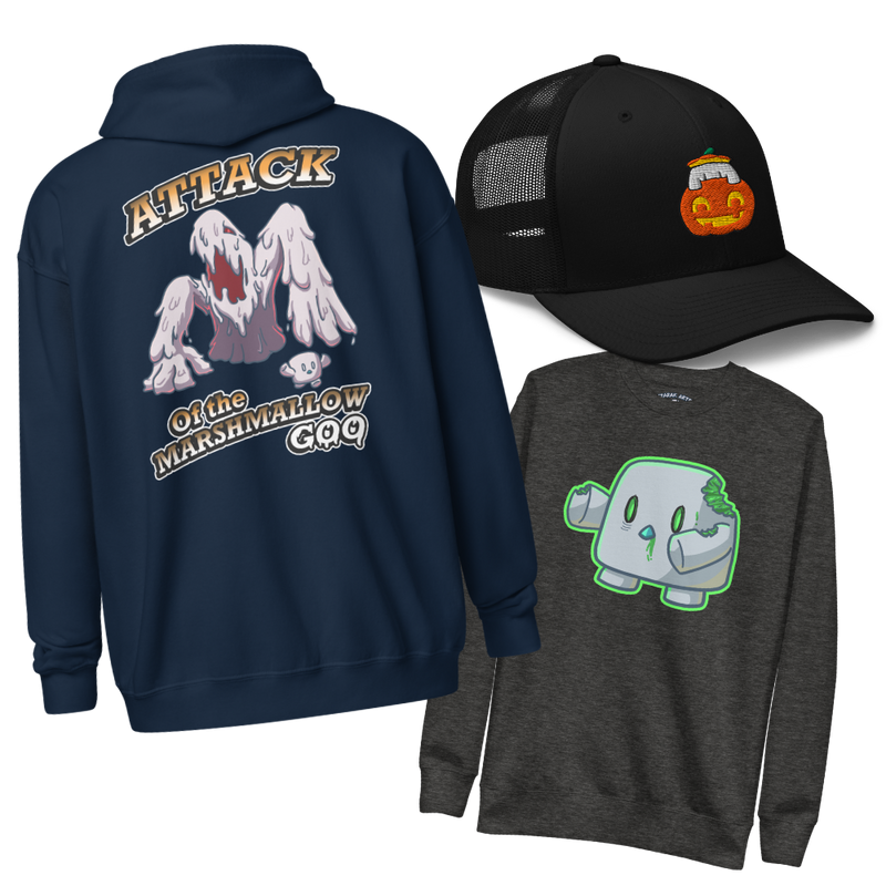 Spooky season is here! From an adorable pumpkin embroidery to scary marshmallow zombies and goo! Get cozy with your new favorite Halloween apparel.